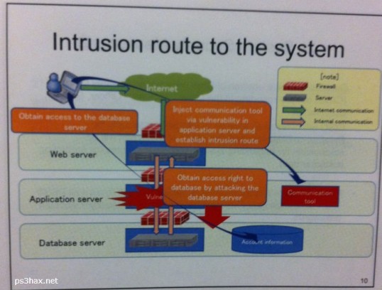 The image above shows how Sony thinks hackers managed to bypass their security in order to steal personal information from PSN accounts. Interestingly it appears the hack didnât originate from a jailbroken PS3 as some had first thought, but a good olâ PC instead. Also of interest is the mention of a vulnerability in Sonyâs application server which, presumable, was exploited in order for the unknown hackers to gain access. Does Sony not patch their servers?